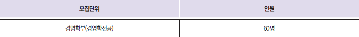 경영학부에 총 60명을 선발하는 특성화고 졸업 재직자 전형입니다.